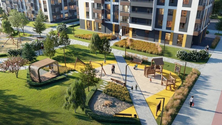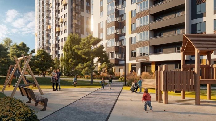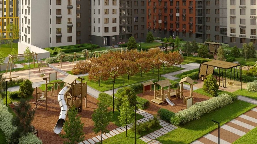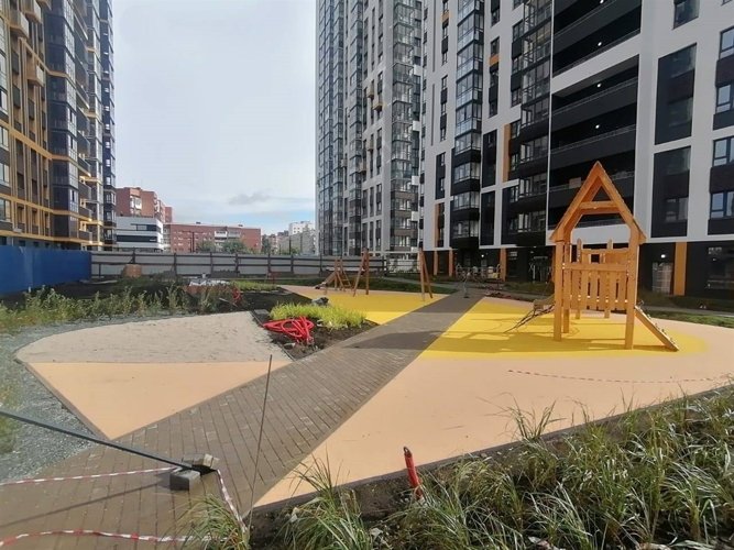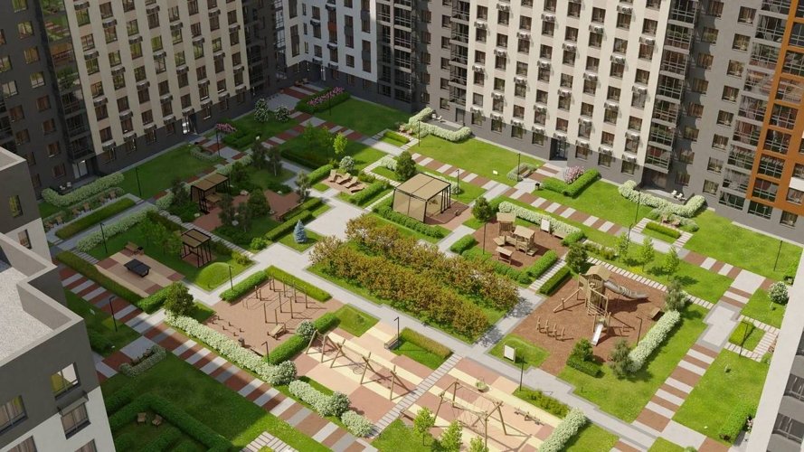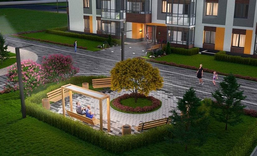 Здесь обустроены зеленые зоны, игровые площадки, прогулочные тропинки, даже велосипедная дорожка.