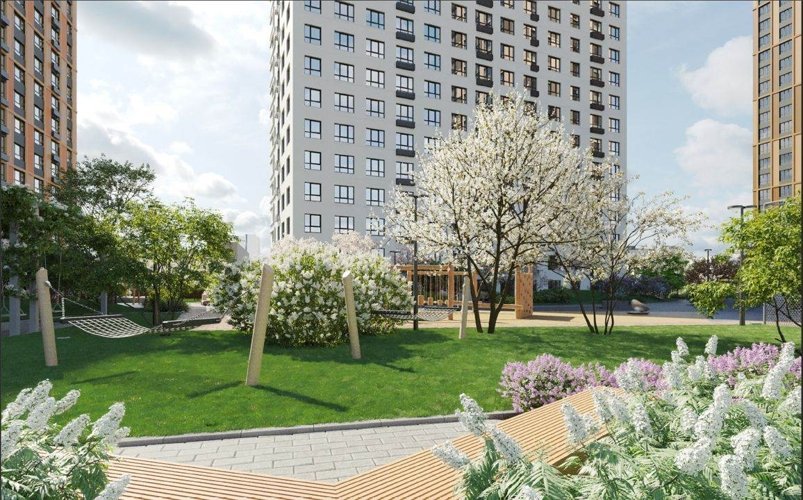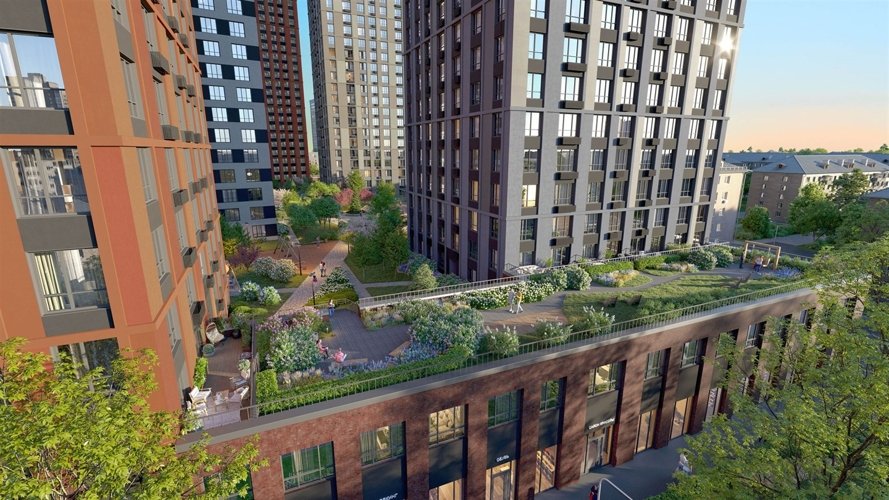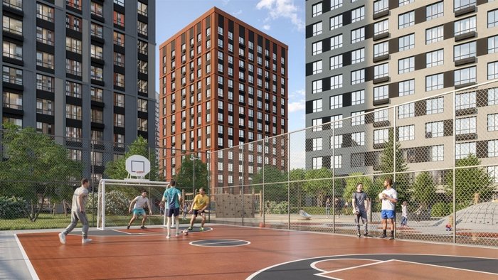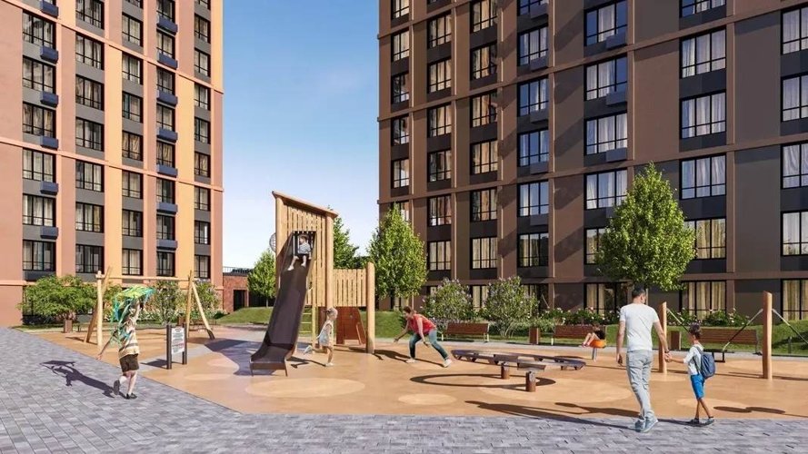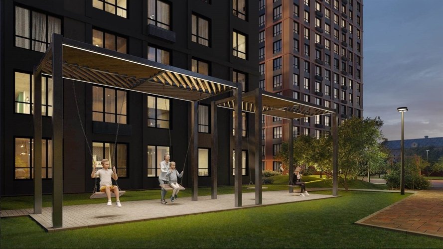 «платформа», которая объединяет дома и создаёт дополнительное пространство для жизни. Двор размещен на крыше стилобата, а под ним для любителей спорта есть воркаут-площадка, отдохнуть можно расположившись на удобных качелях-гамаках и скамейках -шезлонгах, для всех возрастов детей предусмотрено разнообразное по функционалу оборудование.